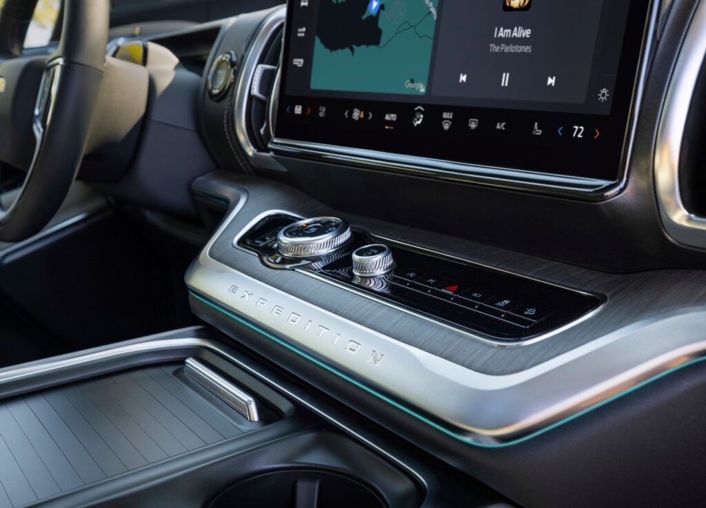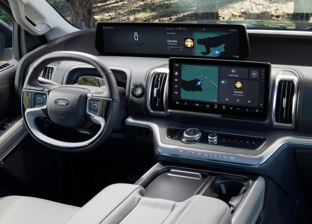 이번 2026 익스페디션 풀체인지의 인테리어 백미는 단연 대시보드 상단에 길게 뻗은 24인치 파노라마 디스플레이입니다. 기존의 계기판 위치를 대체하면서도 훨씬 넓은 영역에 걸쳐 정보를 표시하여 운전자의 시선 이동을 최소화합니다.