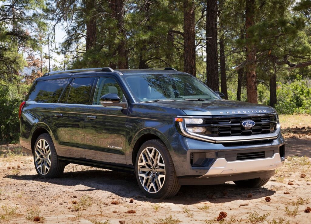 5세대 풀체인지를 거친 2026 포드 익스페디션은 포드의 최신 디자인 언어를 반영하여 더욱 현대적이고 강인한 모습으로 탈바꿈했습니다. 전면부의 가장 큰 특징은 그릴을 감싸는 형태의 새로운 ‘C’자형 주간주행등(DRL)과 이와 유기적으로 연결된 2단 헤드램프입니다. 이 디자인은 차량을 더욱 넓고 낮아 보이게 하는 시각적 효과를 주며, 풀사이즈 SUV 특유의 압도적인 존재감을 완성합니다.